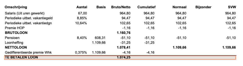 ①Salaris (Uit uren gewerkt):€964.80 → 実際に働いた67時間分の給料