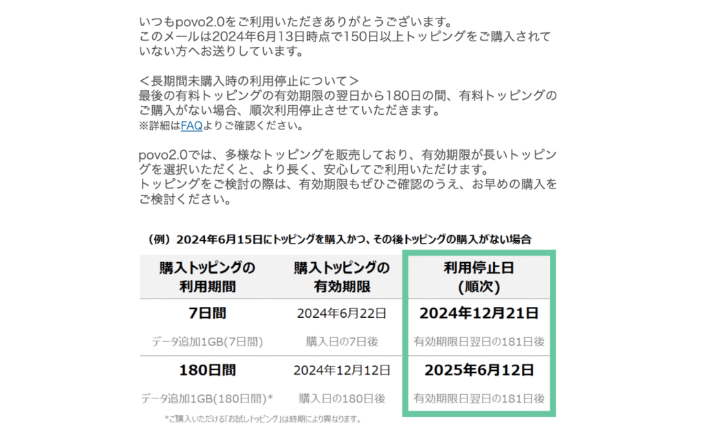 povoからは以下のような、「長期間トッピング未購入に伴う重要なお知らせ」というメールも届くので