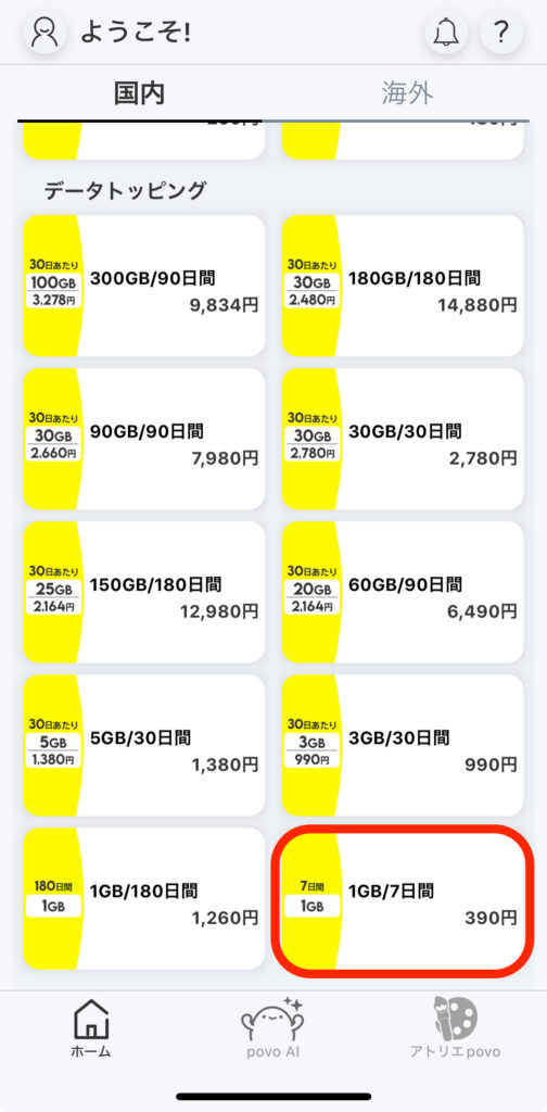 povoは必要なデータ分だけ購入するトッピング制度なのですが